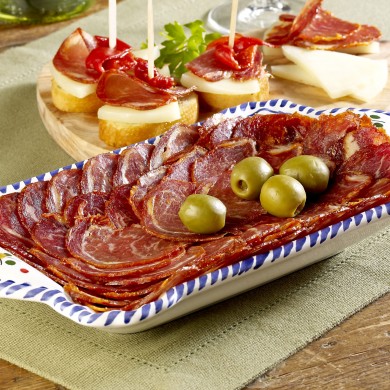이베리코 흑돼지 목살 주변 부위로 만든 최고급 스페인 숙성햄으로 지방층과 살코기층이 조화롭게 섞여 부드러운 식감을 선사합니다.