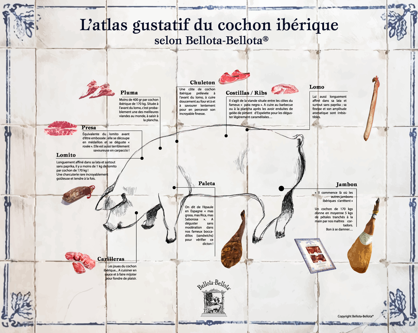 이베리코 흑돼지 목살 주변 부위로 만든 최고급 스페인 숙성햄으로, 170kg 이베리코 돼지에서 오로지 1.5kg 만 생산됩니다. 지방층과 살코기층이 조화롭게 섞여