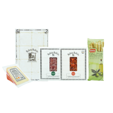 이베리코 살치촌 30g, 이베리코 초리조 30g, 마혼 메노르카 치즈 225g, 미니 브레드 스틱 50g